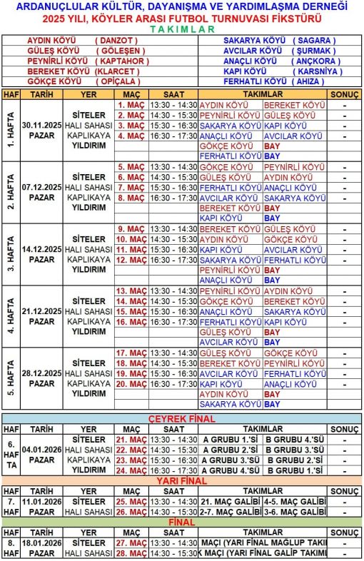 Bursa Artvin Ardanuçlular Derneği'nin düzenlediği köyler arası futbol karşılaşmasının ilk haftasında ( 30 Kasım 2024 saat : 15.30 - 16,30) Karsniya Spor'un rakibi Sakarya Köyü futbol takımı oldu.